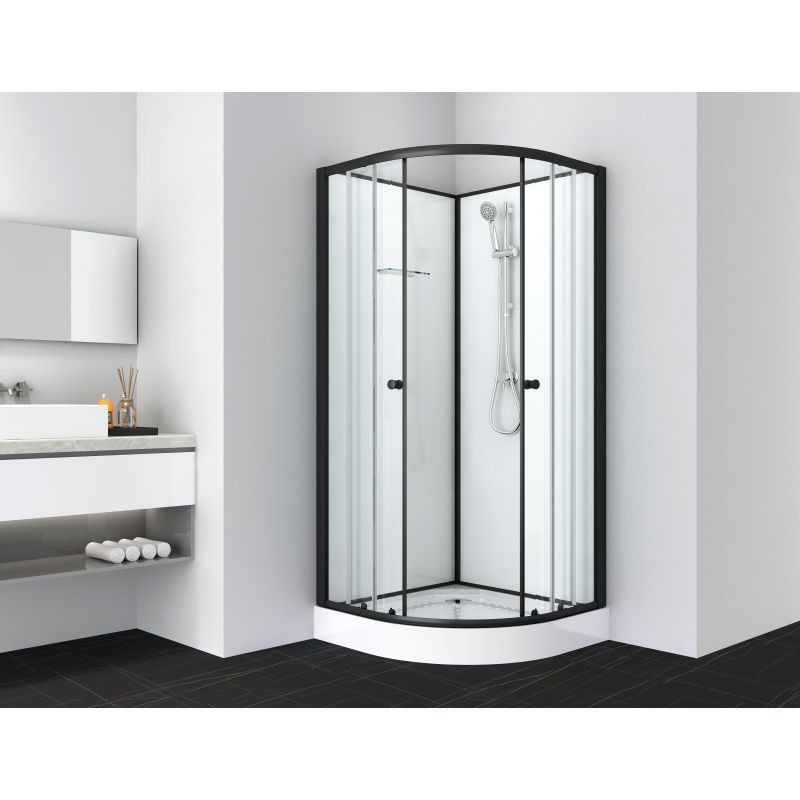 Termékdatok:- íves, komplett zuhanykabin- méret: 90x90x203 cm- fekete színű alumínium keret- frontüvegek: 4 mm-es biztonsági üveg- hátfalak: 4 mm-es fehér biztonsági üveg- keverő csaptelep- többfunkciós, sínes kézi zuhany- piperepolc- zuhanytálca fix előlappal, lábbal, szifonnal (magassága: 15 cm)- fekete ABS fogantyú- szürke ABS görgők- tető nélkülBeépítésben tudunk segíteni!