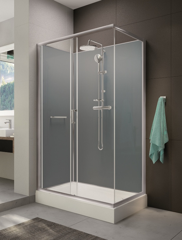A kabin fehér profiljai harmonikusan illeszkednek a fehér hátfal üvegéhez, de elérhető fényes kivitelben is, amely ezüst hátfalüveggel párosul. A hátfal nem átlátszó, így a kabin belső szerelvényei diszkréten rejtve maradnak, ezáltal egységes és esztétikus megjelenést biztosítanak.