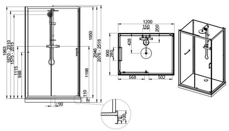 Ez a zuhanykabin 120x90x205 cm-es méreteivel és aszimmetrikus formájával optimális választás mind kisebb, mind nagyobb fürdőszobákba. Az eltolható ajtó megkönnyíti a belépést, miközben helyet takarít meg. A kabin elülső része átlátszó edzett biztonsági üvegből készült, amely elegáns, modern megjelenést kölcsönöz, ugyanakkor biztonságot is nyújt.