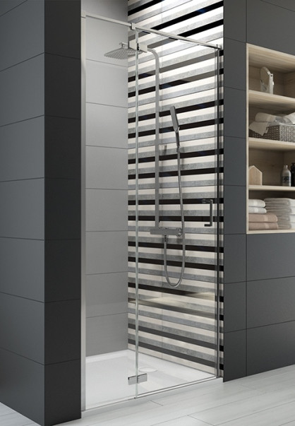 Az átlátszó üveg optikailag tágítja a fürdőszobát, a króm profil modern, letisztult stílust biztosít. A nyílóajtó kialakítás különösen előnyös kisebb fürdőszobákban, ahol a könnyű hozzáférés és a helytakarékosság kiemelten fontos.