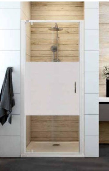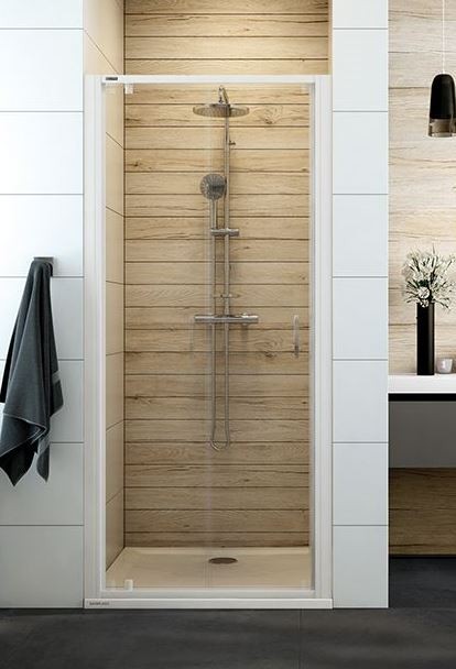 Az átlátszó üveg vizuálisan tágítja a teret, a fehér profil modern és letisztult megjelenést kölcsönöz. A nyílóajtó kialakítás különösen előnyös kisebb fürdőszobákban, ahol a praktikusság és a helytakarékosság kiemelten fontos.