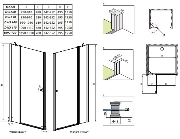 Termékadatok:- kifelé-befelé nyíló zuhanyajtó fix fallal- méret: 109-111x195 cm- 6 mm vastag átlátszó biztonsági üveg- az üveg Easy Clean védőréteg bevonattal ellátott- balos és jobbos kivitelben- elegáns praktikus fogantyúk, kívül-belül- nagy stabilitást biztosító tartó rudak- precíz vízzárást biztosító emelőmechanikás oldalprofil az üveg teljes hosszában- a mechanika közel 180 fokos mozgást tesz lehetővé- króm küszöb- 2+1 év garancia- lengyel gyártmány