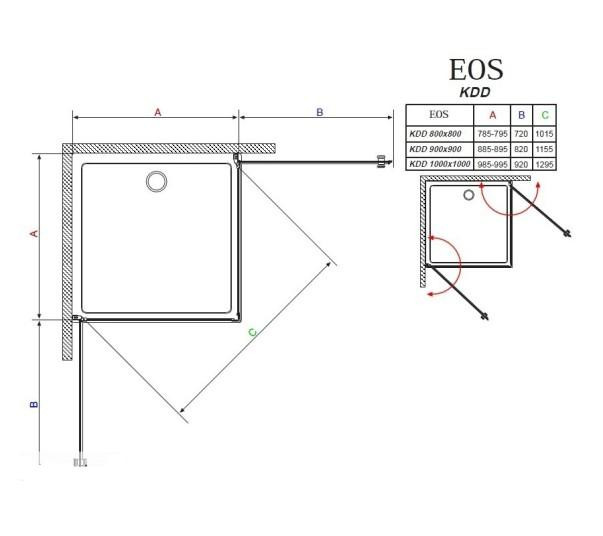 EOS KDD 100x100 szögletes, nyíló ajtós zuhanykabin méretei
